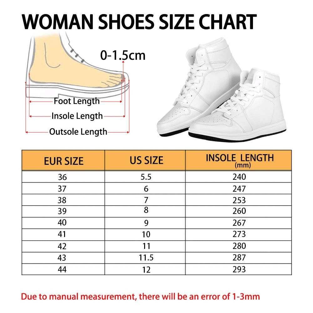 - Each pair of Sneaker Boots is custom printed, cut, and sewn just for you when you place your order – there may be small differences in the design on the seams and /or arms due to the custom nature of the production process!